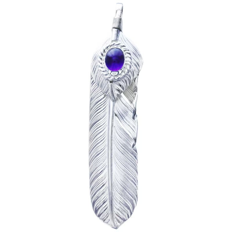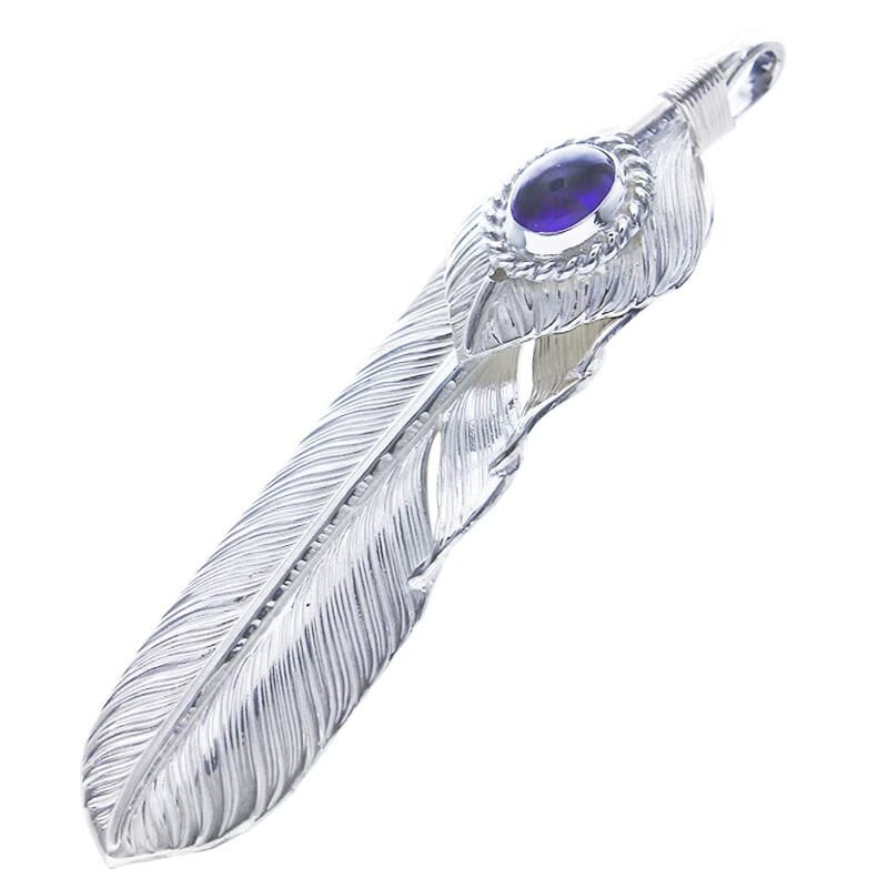LフライトフェザーペンダントにLフライトハートフェザとアメジストをセットしたフェザーペンダント(左向き)。